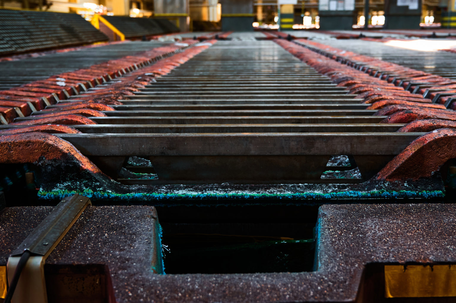 Process of copper refinement in large electrolysis bathtub with installed metal anodes at production plant extreme closeup